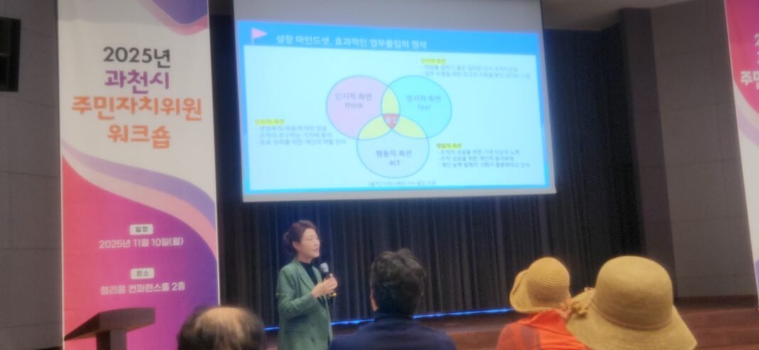 과천시는 2025년 11월 10일 경기도 가평군의 수련원 ‘청리움’에서 시장과 각 동장, 주민자치위원 등이 참석한 가운데 ‘2025 과천시 주민자치 워크숍’을 개최했다. 워크숍은 전문가 특강과 다양한 체험 프로그램으로 진행되며 주민자치위원들의 적극적인 참여 속에 성황을 이뤘다.