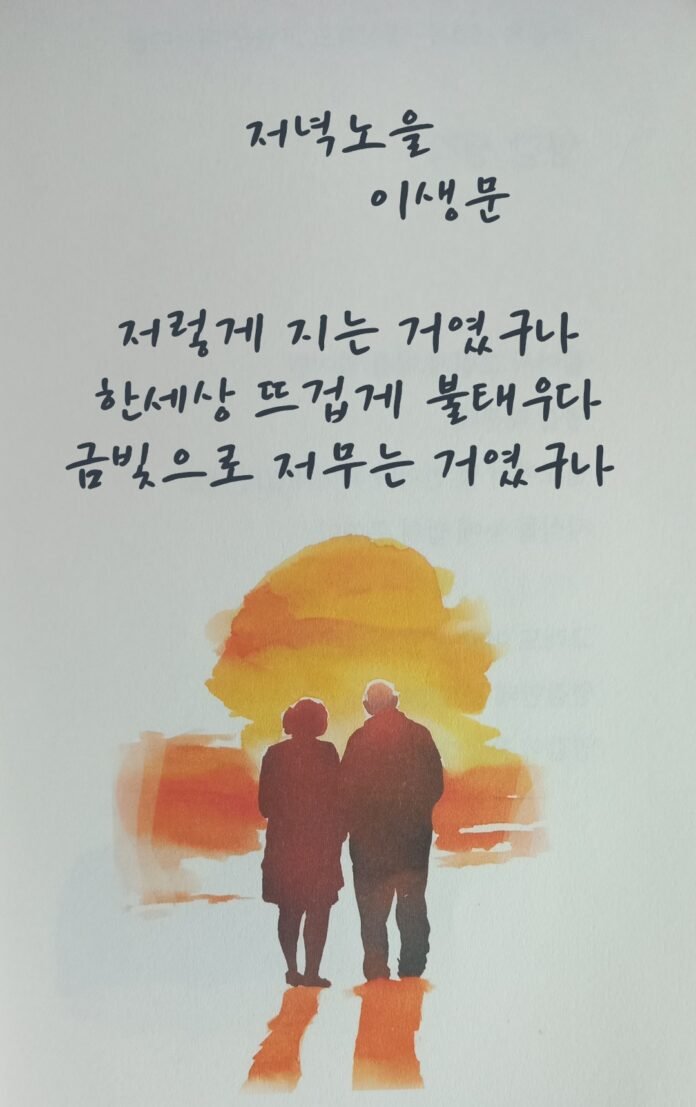 이 시 ‘저녁노을’은 2025년 제2회 짧은 시 공모전 ‘어르신의 재치와 유머’ 부문에서 대상으로 선정된 작품입니다. 단 세 줄로 구성된 간결한 시 속에 함축된 정서의 울림이 가득해 그 미학이 돋보입니다. 시는 저녁노을을 바라보며 인생의 황혼을 노래하고 있습니다.
